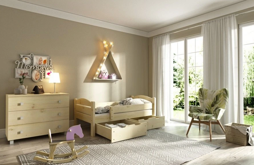 Postel ze smrkového masivu Matěj MINI je skvělou volbou pro rodiče, kteří hledají funkční a bezpečné lůžko pro své děti. Díky praktickým bezpečnostním bariérám, které lze snadno odstranit, se postel během chvilky promění v klasické samostatné lůžko.