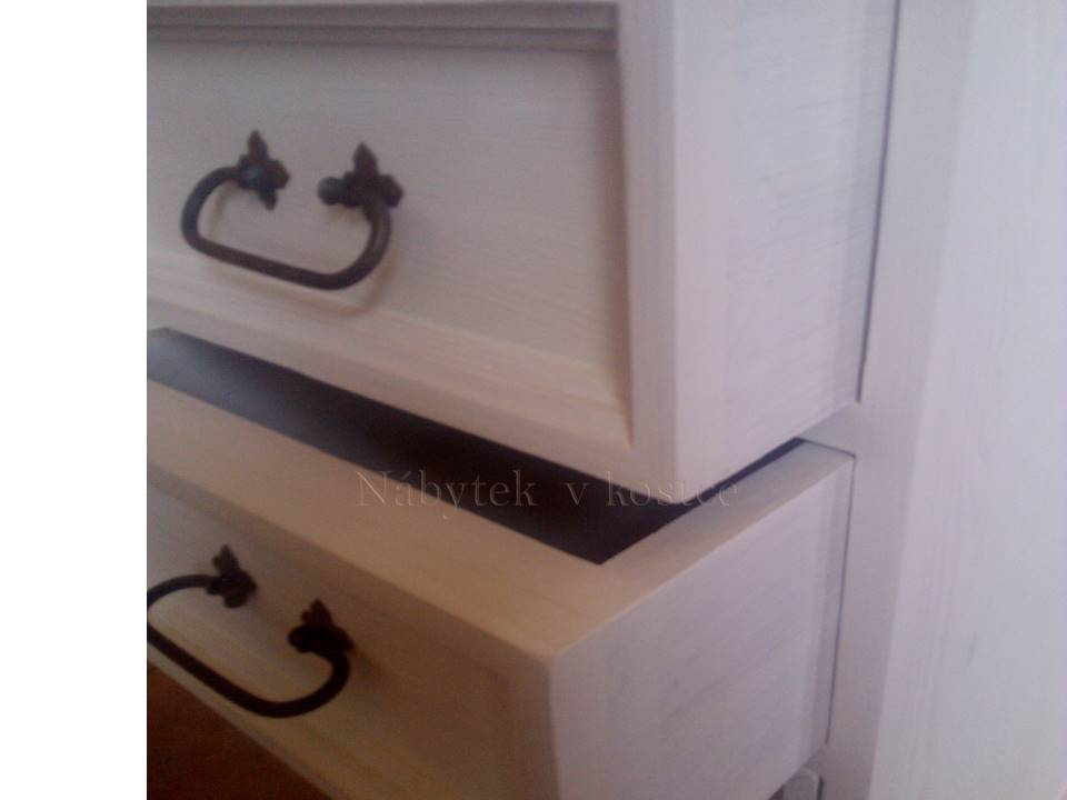 Za zmínku také stojí retro úchyty psacího stolu, které jsou účelově zrezivělé – zkorodované, a ozdobné frézování, které poskytuje nábytku celé kolekci Sweet Home nezaměnitelný půvab a jedinečnost venkova.