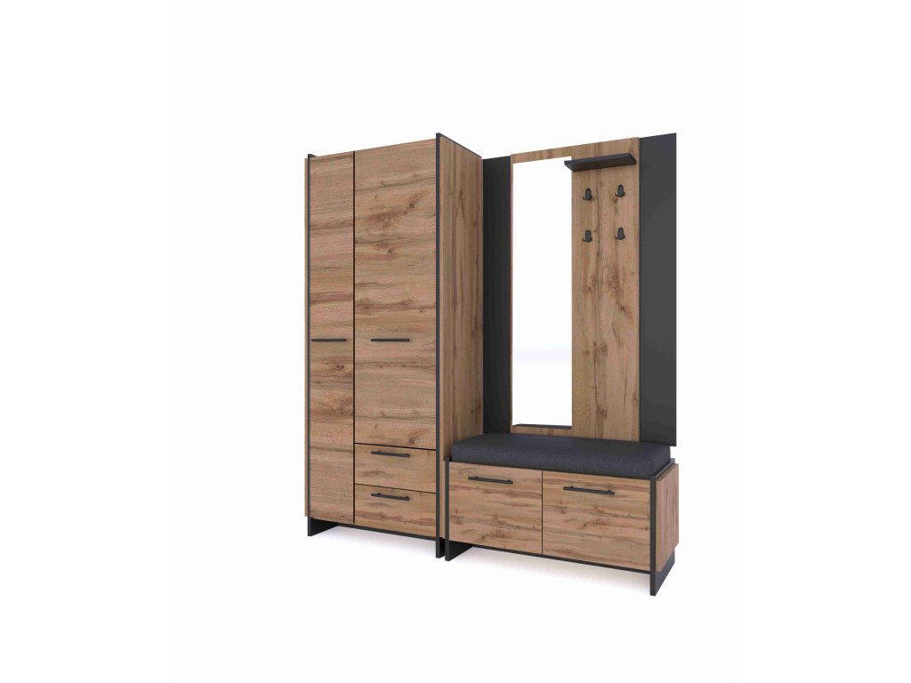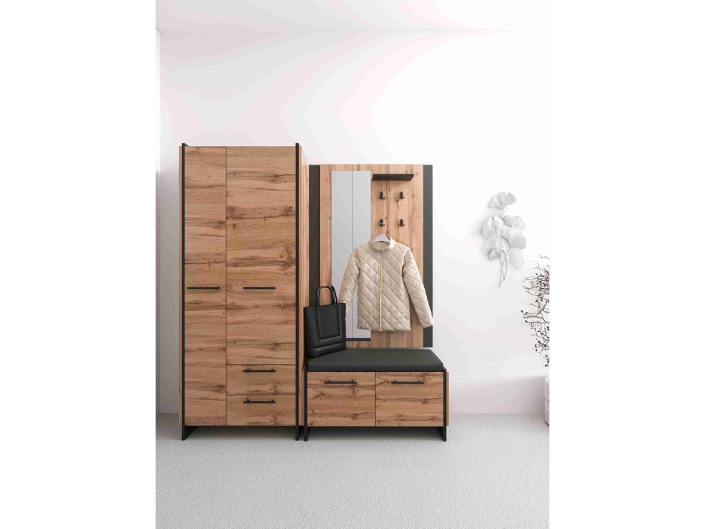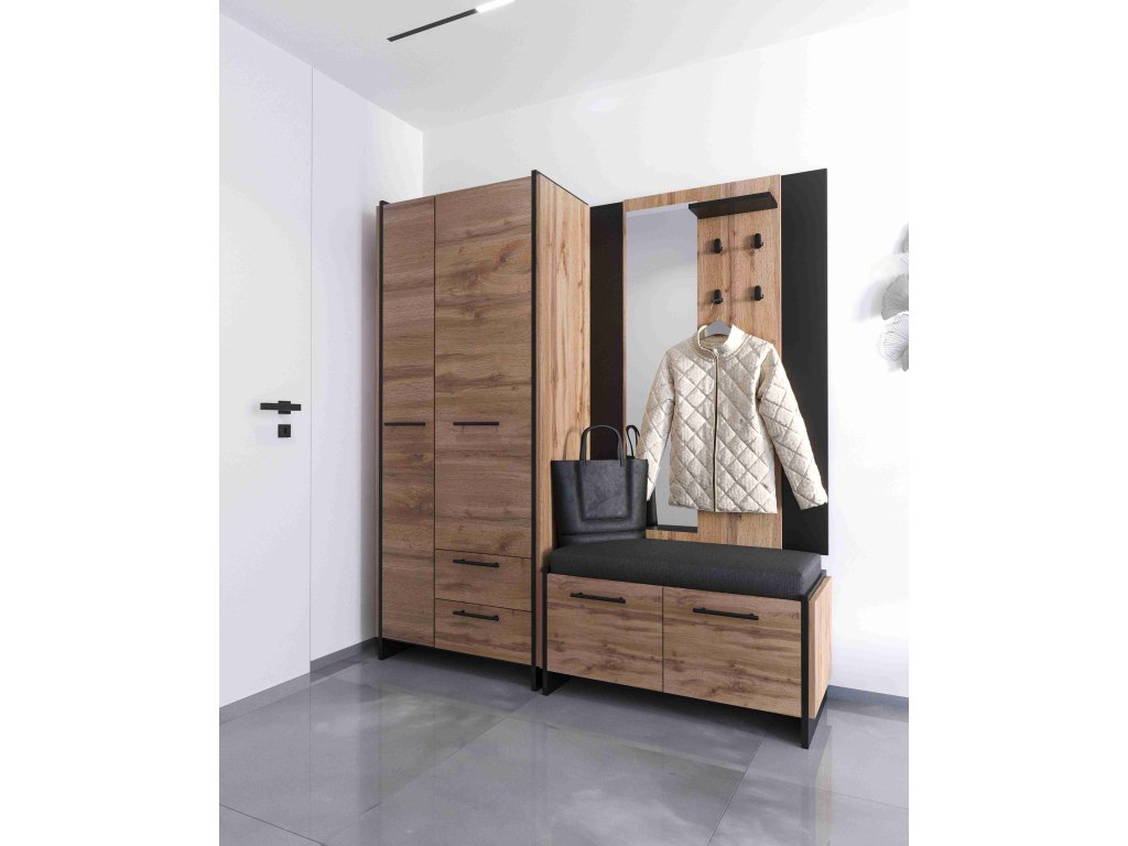 3atní skříň do předsíně má moderní, industriální styl a atraktivní dekor 🌳 dub wotan/černá, který přináší do interiéru nádech přírody i moderní design.