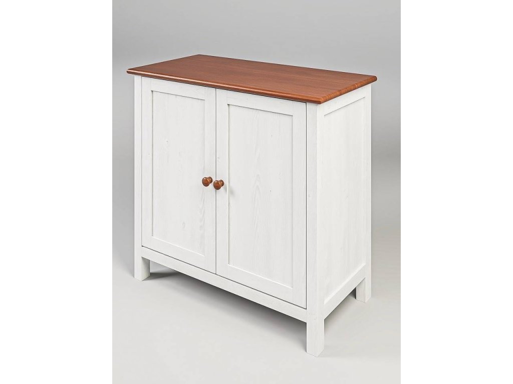Za dvířky komody se nachází dvě prostorné police, ideální pro uložení nádobí, textilu nebo dalších drobností.