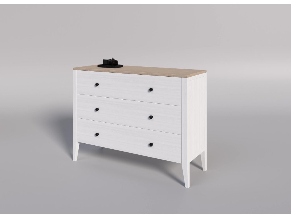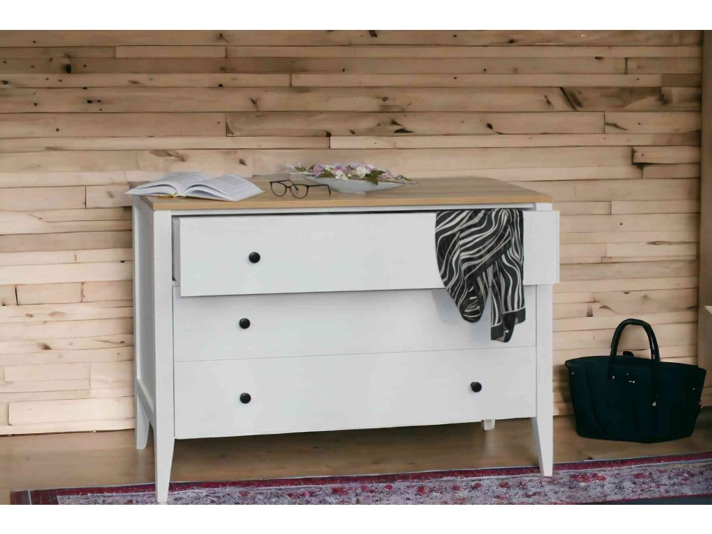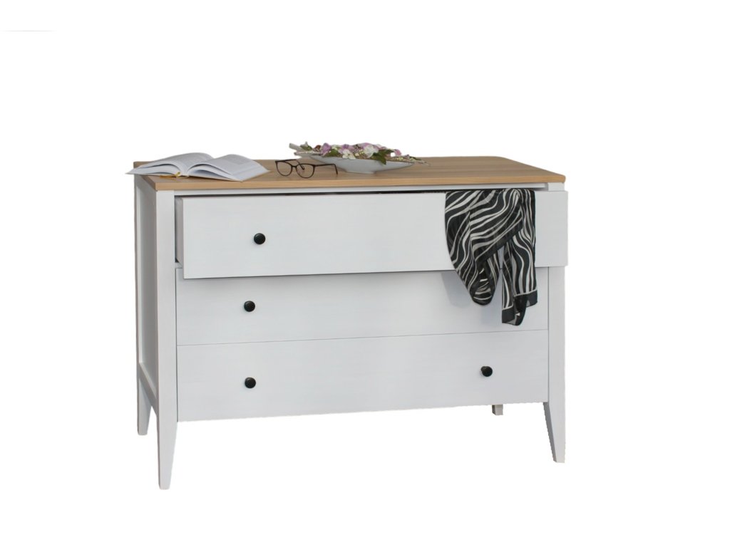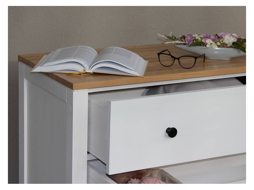 Masivní komoda ROMA White KT1 se systémem tichého zavírání je moderní šuplíková komoda z masivu, která se prezentuje jednoduchými liniemi a krásnou dřevitou kresbou.