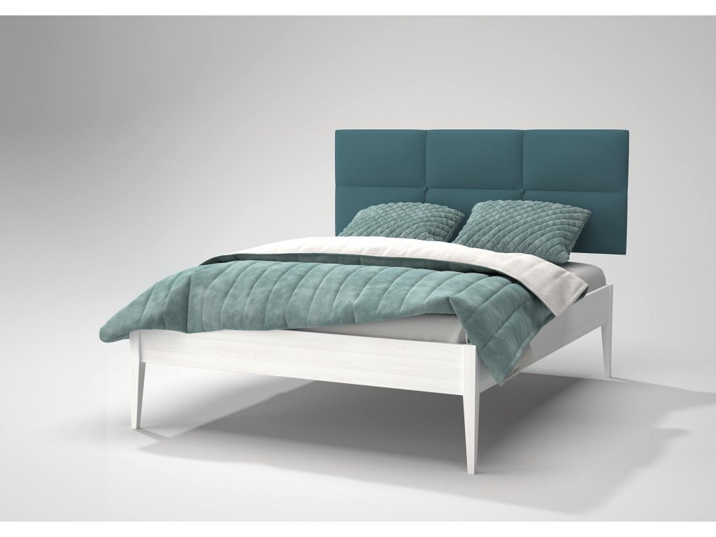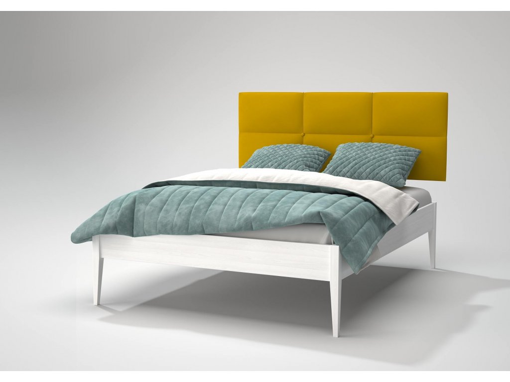Buková postel ROMA White vyniká designovým čalouněným čelem s volitelnou barvou potahu - žlutá anebo zelená.