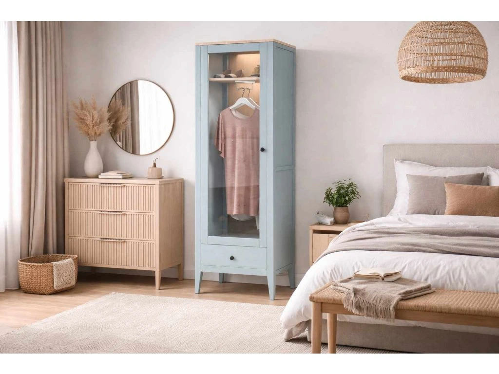 Masivní skříň ROMA SST1 šedomodrá se šatní tyčí se systémem tichého zavírání je moderní skříň z masivu, která se prezentuje jednoduchými liniemi a krásnou dřevitou kresbou.