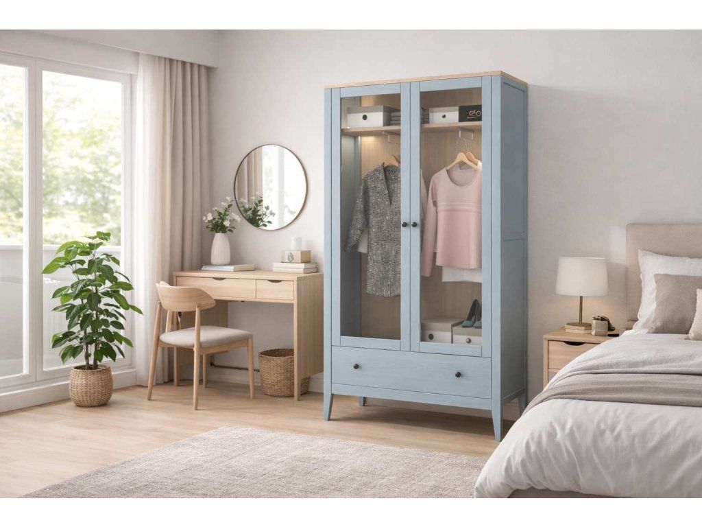 Buková šatní skříň ROMA SST3 v šedomodré barvě zaujme skandinávským stylem, který spojuje nadčasový design a funkční vnitřní členění. Je vyrobena z odolného bukového masivu, který zaručuje pevnost, stabilitu a dlouhou životnost.