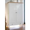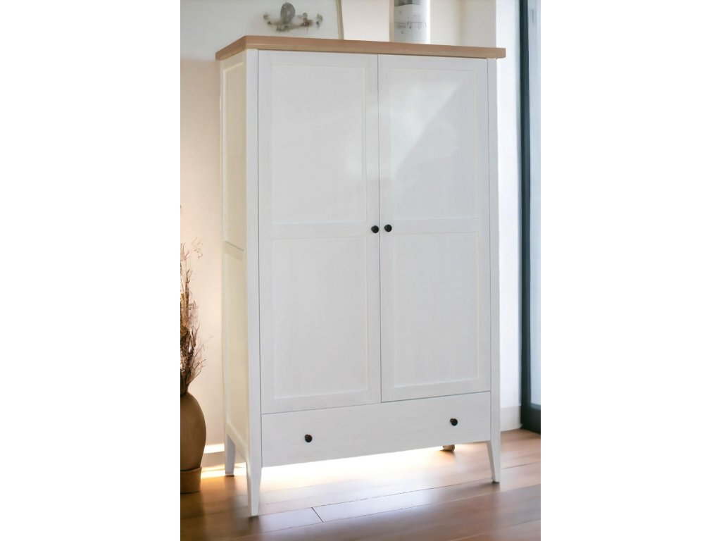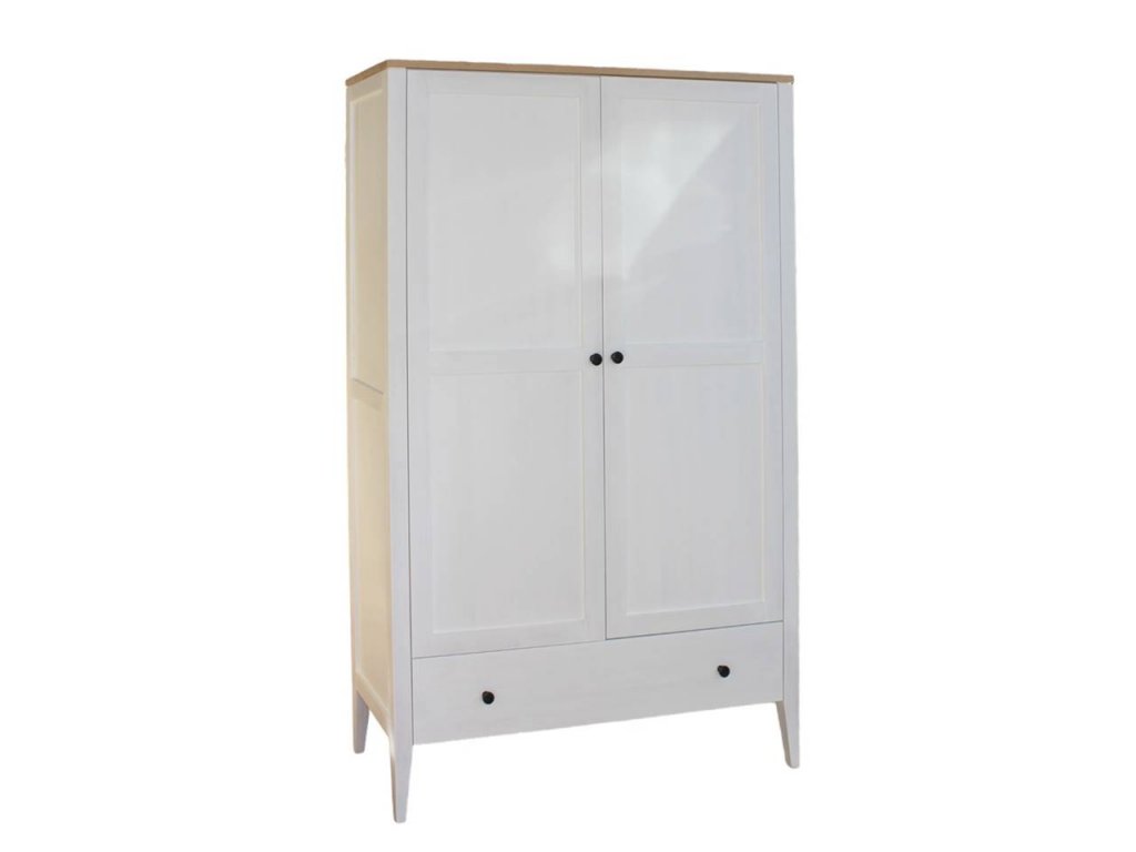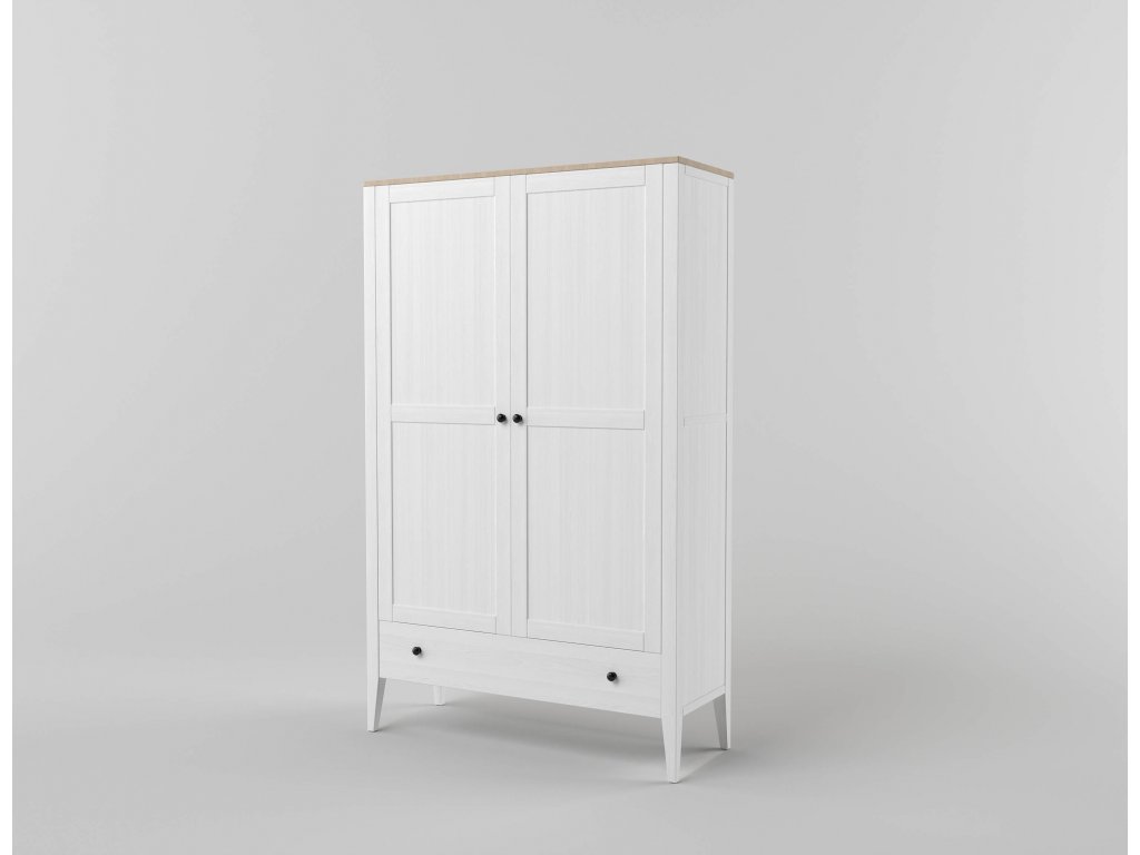 Bílá dvoudveřová šatní skříň ROMA SST3PD s rozměry 195 × 120 × 45 cm a výškou nožek 20 cm je vyrobena z kvalitního bukového masivu. Díky plným dřevěným dvířkům působí elegantně a nadčasově. Světlé bílé provedení skříň opticky odlehčí a prosvětlí interiér. Praktický prostor pod skříní navíc umožňuje snadný úklid – ideální pro robotické vysavače.
