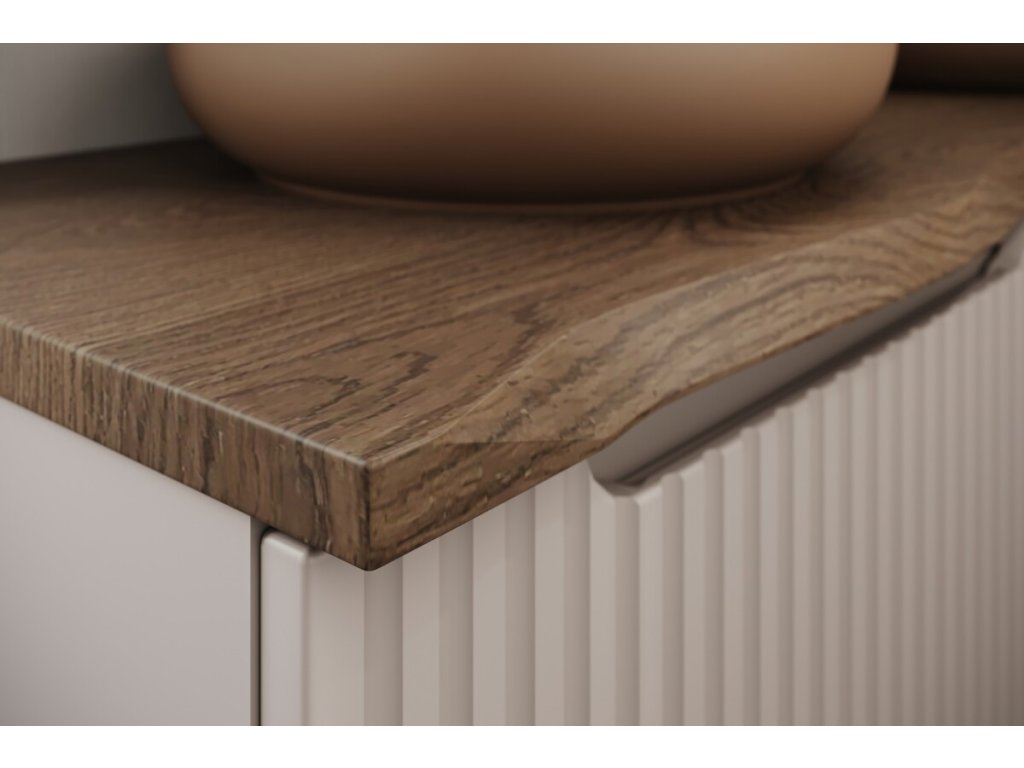 Koupelnová deska Nature 60 cm na koupelnovou skříňku zaujme designem inspirovaným přírodním dřevem. Nepravidelná, jemně zvlněná hrana imituje přirozeně řezané dřevo a dodává interiéru útulný a autentický vzhled.