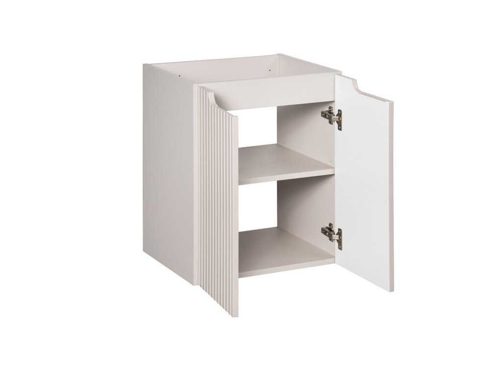 Skříňka pod umyvadlo o šířce 60 cm z kolekce Nova Kašmír je ideální volbou pro moderní koupelny, kde se snoubí estetika s praktičností. Její design stojí na čistých liniích, výrazném vertikálním frézování MDF dvířek a integrovaném podhmatu, který podtrhuje nadčasový vzhled a zajišťuje komfortní používání.