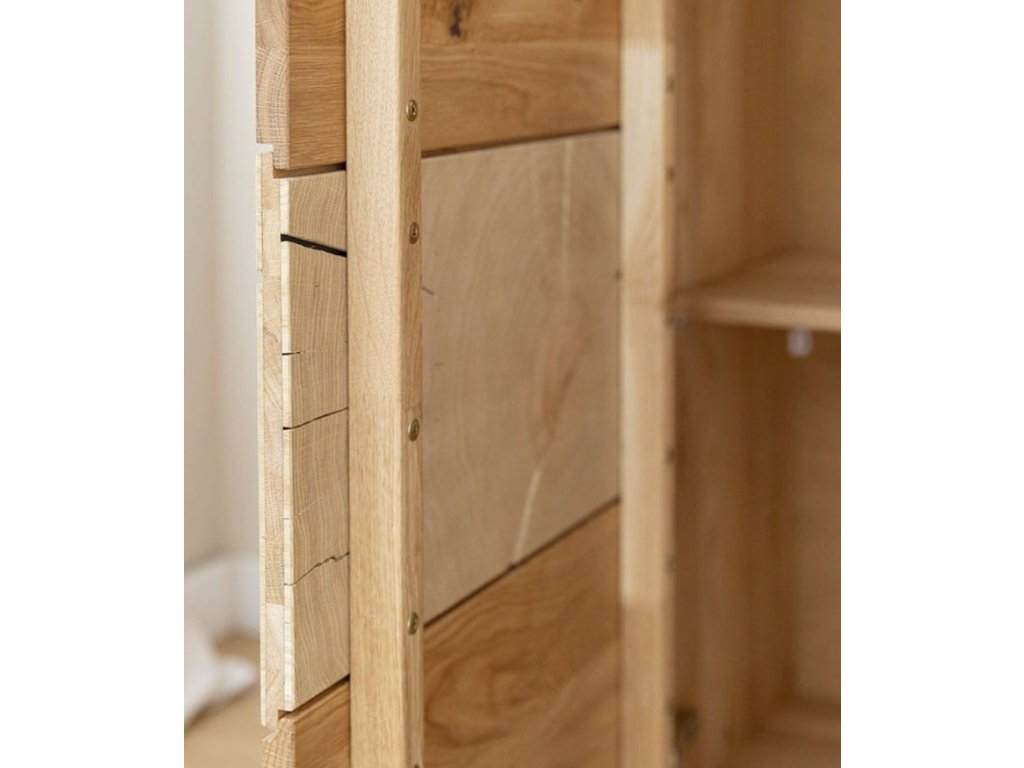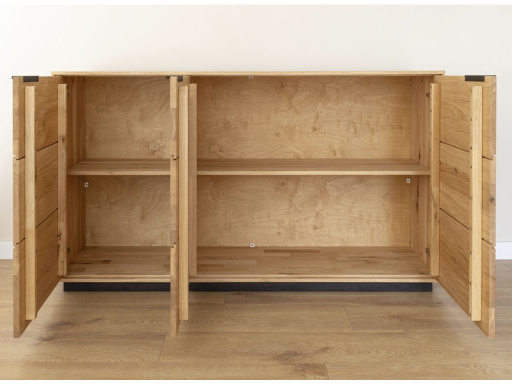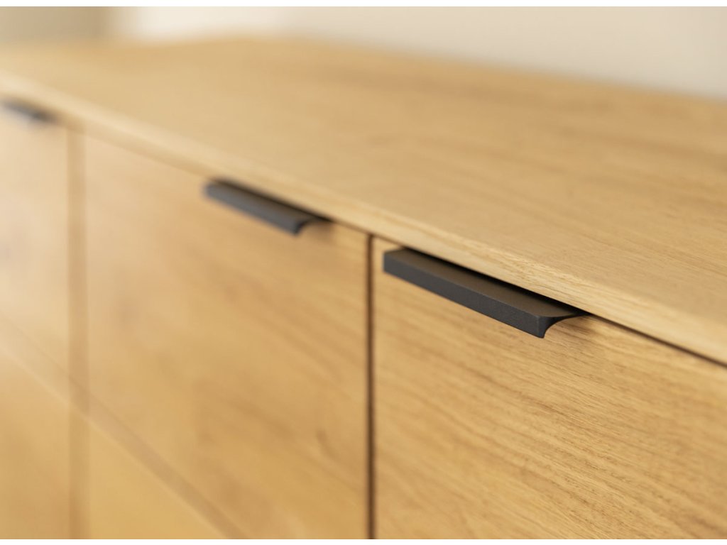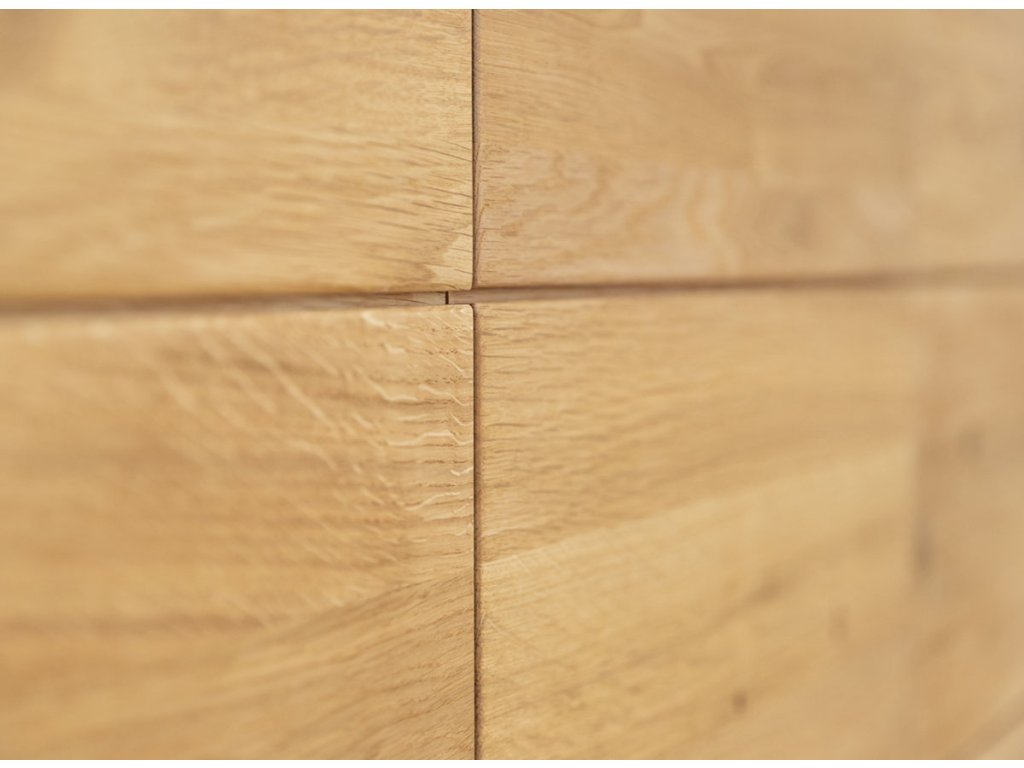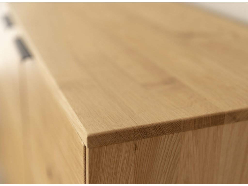 Dubová Komoda TIRANO 3D nabízí dostatek úložného prostoru, přičemž její minimalistický design nechává vyniknout přirozené kráse dřeva.