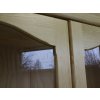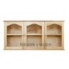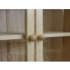 Horní kuchyňská skřínka se sklem z masivu DEJ50 je velmi originální a tvarově atypická. Tato vitrína je rozdělená do dvou samostatných částí a je uzavíratelná 3 prosklenými dvířkami. V každé části je jedna polička. Závěsná skřínka DEJ50 je vyrobená z masivního borovicového dřeva s důrazem na využití minimálního množství suků.