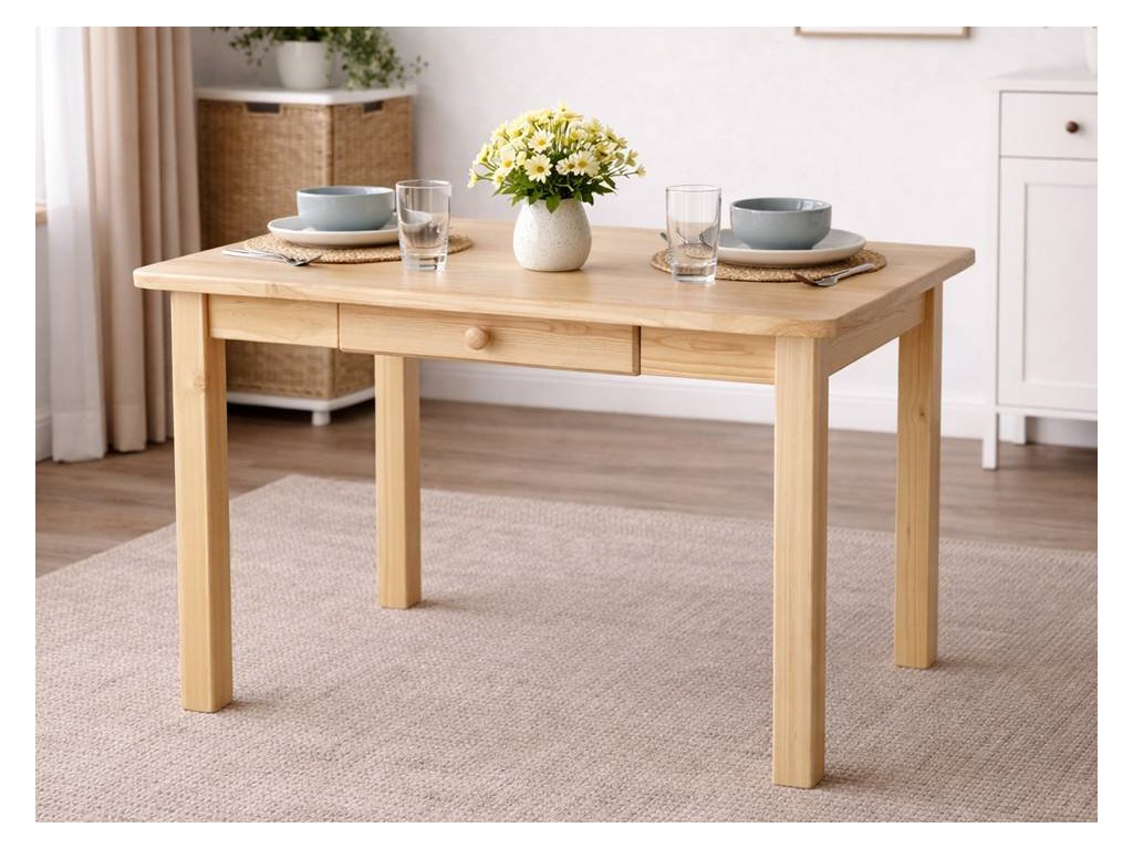 Jídelní stůl z masivu je velmi stylový a působí velice příjemným dojmem. Stůl má praktický malý šuplík, kde lze uschovat příbory , ubrousky nebo jiné drobnosti. Stůl je vyroben z borovicového masívu v přírodní barvě. K tomuto stolu nabízíme stylové židle z masivu.