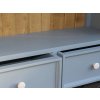 Knihovna z masivu PROVENCE je spojením bukového a dubového dřeva. Dubové dřevo (horní deska) je ošetřeno lakem a bukové dřevo je ošetřeno akrylovou barvou v šedomodré barvě. Šuplíky jsou bez pojezdů. Možnost objednání se systémem tichého dovírání (u šuplíků).