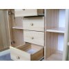 Komoda DEJ58 se skládá ze dvou uzavíratelných skříňek s policí, a až čtyř výsuvných šuplíků. Všechny šuplíky jsou na kvalitních kovových pojezdech. Celá komoda je postavena na kulatých nožkách. Pokud byste chtěli zvolit menší komodu stejného typu, doporučujeme komodu DEJ59.