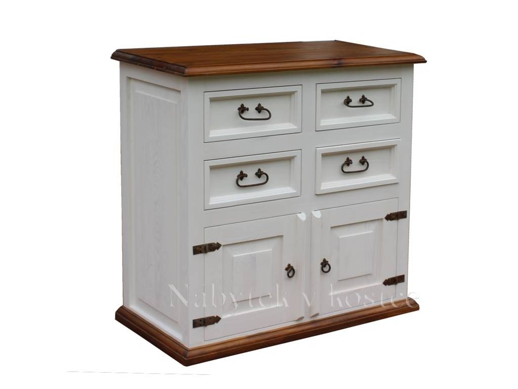 Komoda z masivu je ošetřena bílou vodou ředitelnou barvou, anebo ve dvoubarevné kombinaci (viz. vzorník).