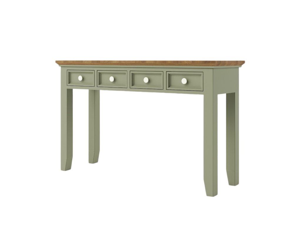 Masivní konzolový stolek PROVENCE je vyroben z masivního bukového dřeva a ošetřen akrylovou barvou v krémovém, olivovém, bílém nebo šedomodrém odstínu. Vrchní deska je vyrobená z masivního dubového dřeva a ošetřena lakem.