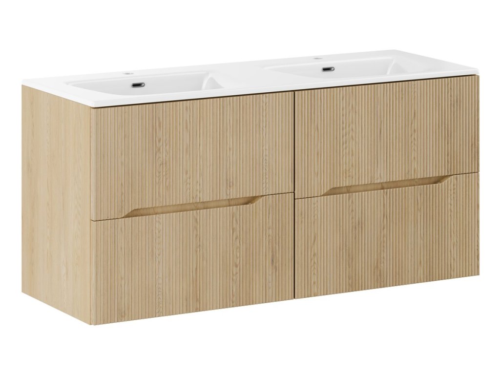 Koupelnová skříňka pod umyvadlo Nordic Cremona 120 cm se čtyřmi zásuvkami a horní deskou představuje harmonické spojení moderního designu a přirozené elegance. Dvířka zdobené jemným vertikálním drážkováním dodávají nábytku lehkost a sofistikovaný vzhled. Dekor Dub Cremona navíc přináší do koupelny teplý přírodní tón inspirovaný krásou skutečného dřeva.