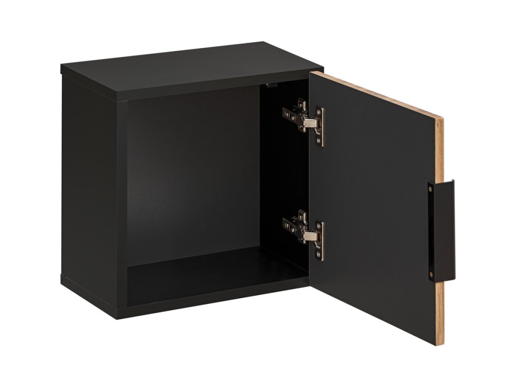 Závěsná skříňka do koupelny XILO je opatřena stylovými černými úchytkami. Model je závěsný, což je praktické pro úklid koupelny.