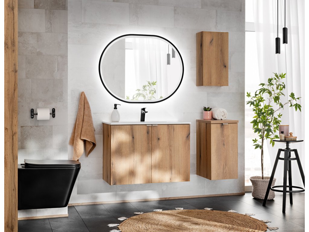 Nábytek v dekoru přírodního dubu přináší do interiéru pocit tepla a přirozenosti. Tento elegantní povrch v kombinaci s minimalistickými liniemi zajišťuje, že skříňka harmonicky zapadne do různých stylů koupelen, od moderních až po rustikální.