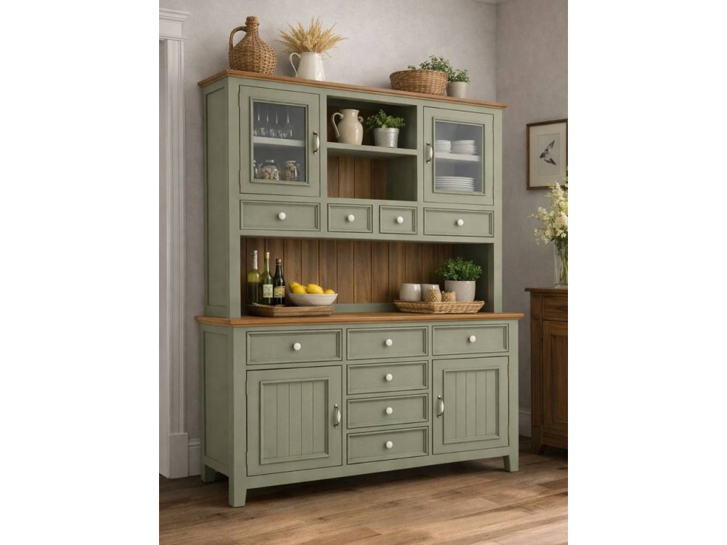 Masivní kredenc PROVENCE je vyrobená z masivního bukového dřeva a ošetřená akrylovou barvou v olivovém odstínu. Vrchní deska je vyrobená z masivního dubového dřeva a ošetřená lakem.