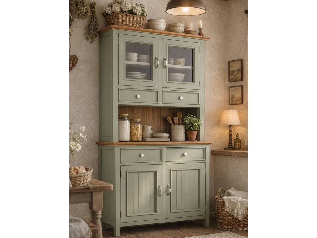 Masivní kredenc PROVENCE je kredenc vyrobená z masivního bukového dřeva, které je ošetřeno akrylovou barvou v olivovém odstínu, a z masivního dubového dřeva (horní deska), které je ošetřeno lakem. Díky spojení těchto dvou druhů masivního dřeva získala masivní kredenc jedinečný vzhled, který zdokonalí veškerý interiér.