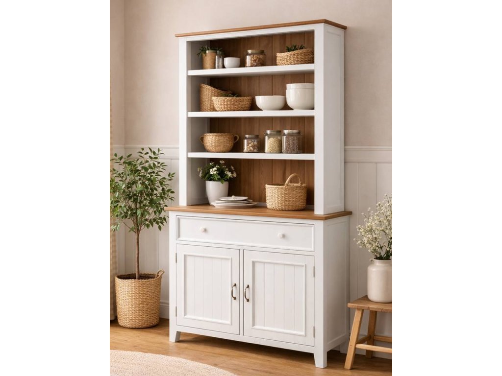 Kredenc z masivu PROVENCE je spojením bukového a dubového dřeva. Dubové dřevo (horní deska) je ošetřeno lakem a bukové dřevo je ošetřeno akrylovou barvou v bílé barvě. Šuplík je bez pojezdů. Možnost objednání se systémem tichého dovírání (u šuplíků).