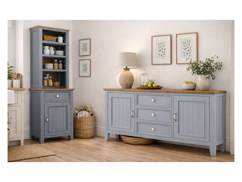 Masivní kredenc PROVENCE je vyroben z masivního bukového dřeva a je ošetřen akrylovou barvou v šedomodré barvě. Vrchní deska je vyrobená z masivního dubového dřeva a je ošetřena lakem.