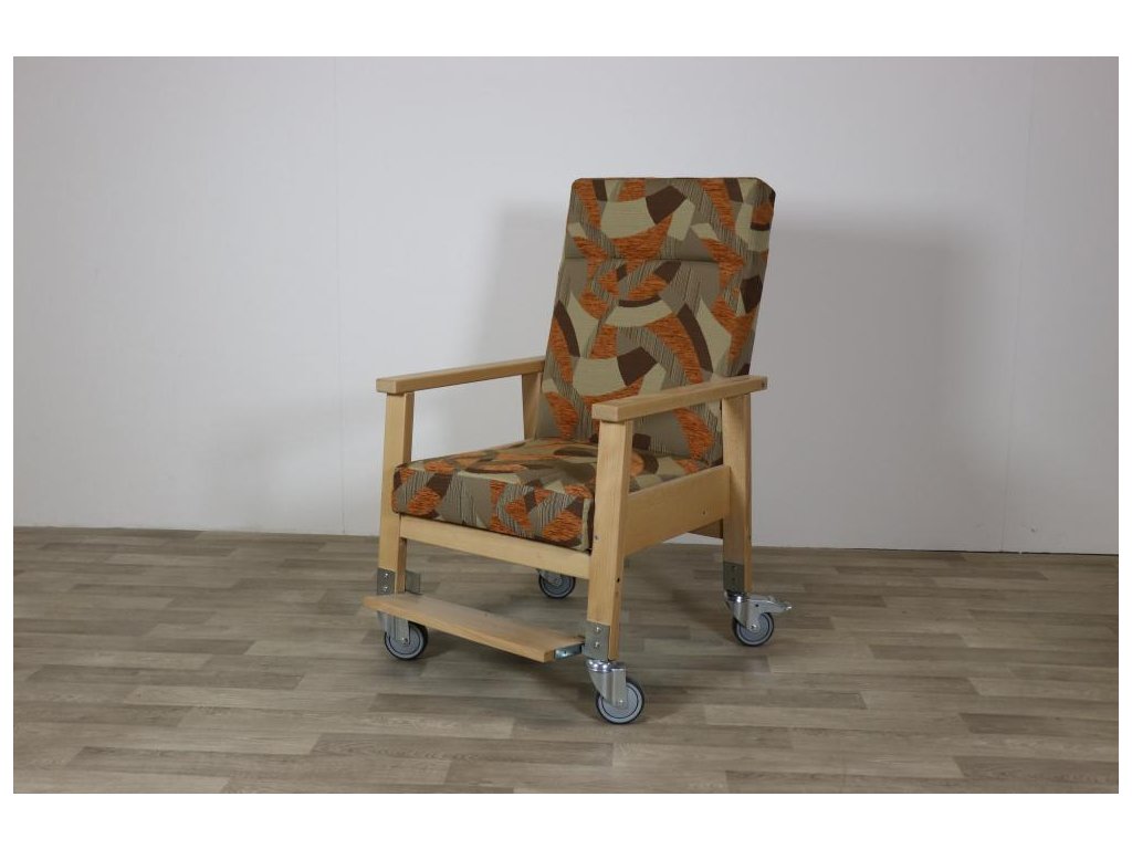 Křeslo JAKUB NA KOLEČKÁCH – čalouněné křeslo s dřevěnými područkami a kolečky, vhodné pro seniory