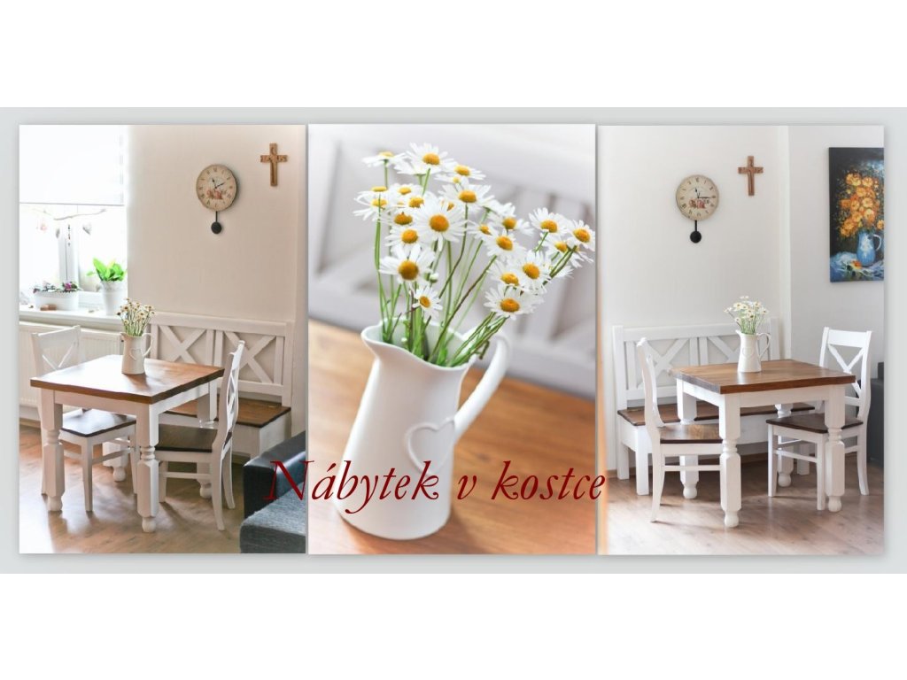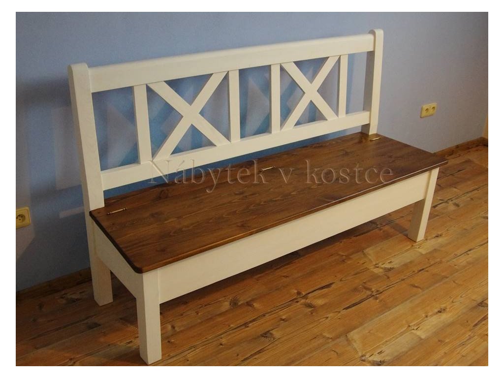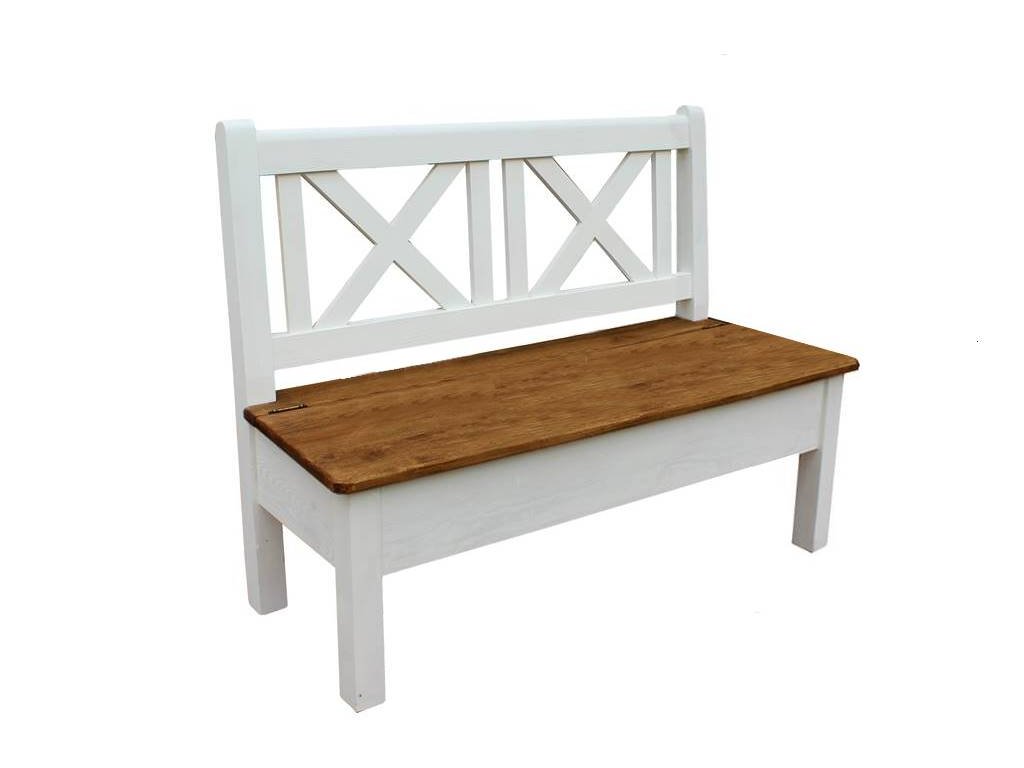 Rustikální lavice SWEET HOME s úložným prostorem je vyrobena z borovicového masivního dřeva a je ošetřena bílou vodou ředitelnou barvou. Horní deska je ošetřen barevným pigmentem v odstínu světle hnědá medová a následně lakem.