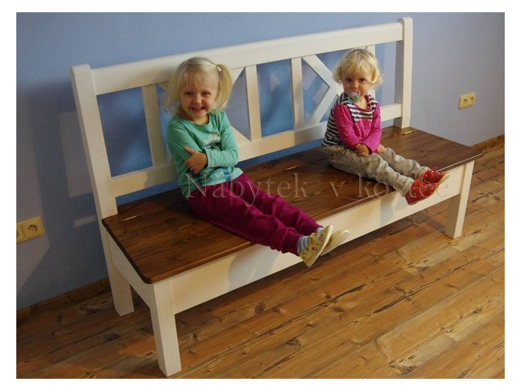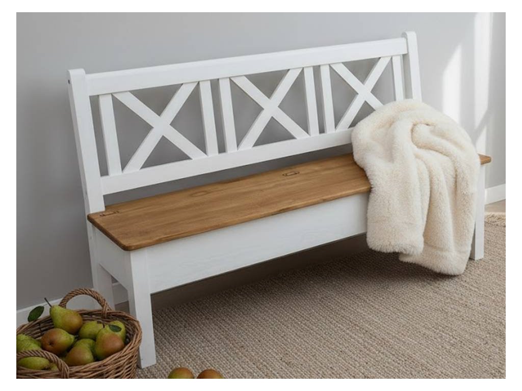 Rustikální lavice SWEET HOME s úložným prostorem je vyrobena z borovicového masivního dřeva a je ošetřena bílou vodou ředitelnou barvou. Horní deska je ošetřen barevným pigmentem v odstínu světle hnědá medová a následně lakem.