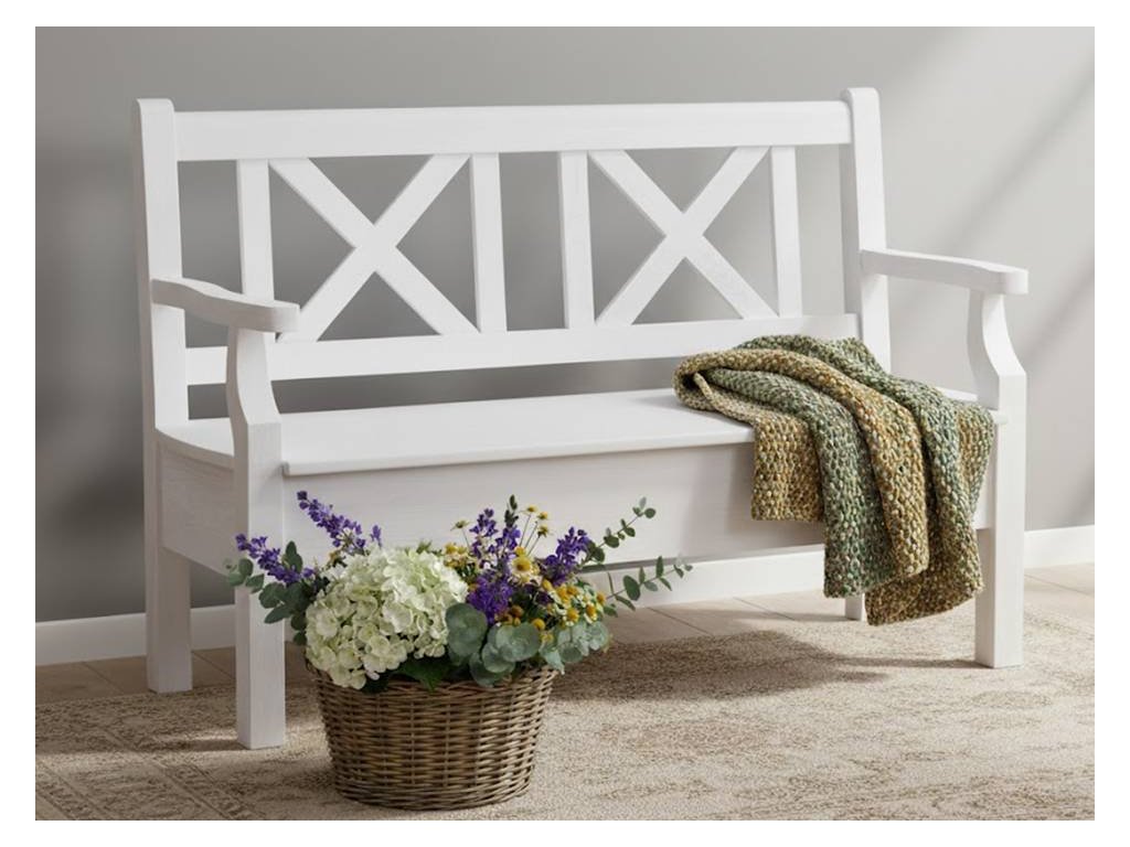 Rustikální lavice SWEET HOME s úložným prostorem je vyrobena z borovicového masivního dřeva a je ošetřena bílou vodou ředitelnou barvou.