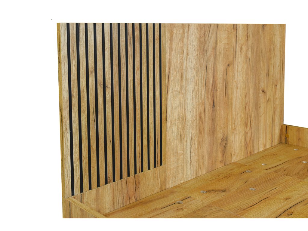 Dvoulůžková postel ELISE 160x200 cm v moderním industriálním stylu kombinuje dekor zlatý dub s černými kovovými prvky, čímž vytváří elegantní a výrazný kontrast. Designové drážkované čelo dodává posteli jedinečný vzhled a podtrhuje charakter celé kolekce.
