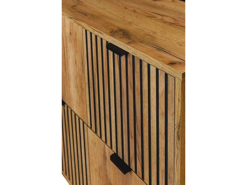 - ✓ Odolné materiály: Vyrobena z kvalitních nábytkových desek (MDF) s odolnou PVC hranou, které zaručují dlouhou životnost a snadnou údržbu. Robustní kovové nohy a akcenty dodávají stabilitu a podtrhují industriální charakter.