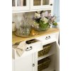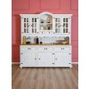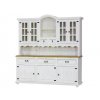 Masivní kredenc WHITE HOME se skládá ze dvou dílů. V horní levé a pravé straně jsou skleněné dveře, za nimiž jsou dvě police. Dveře oddělují dvě zásuvky, nad nimiž je umístěna police. Ve spodní části jsou tři dřevěné zásuvky a skříňky, v nichž se nachází jedna police. Kredenc stojí na kulatých nožkách.