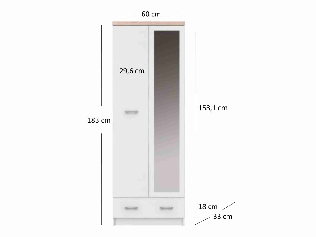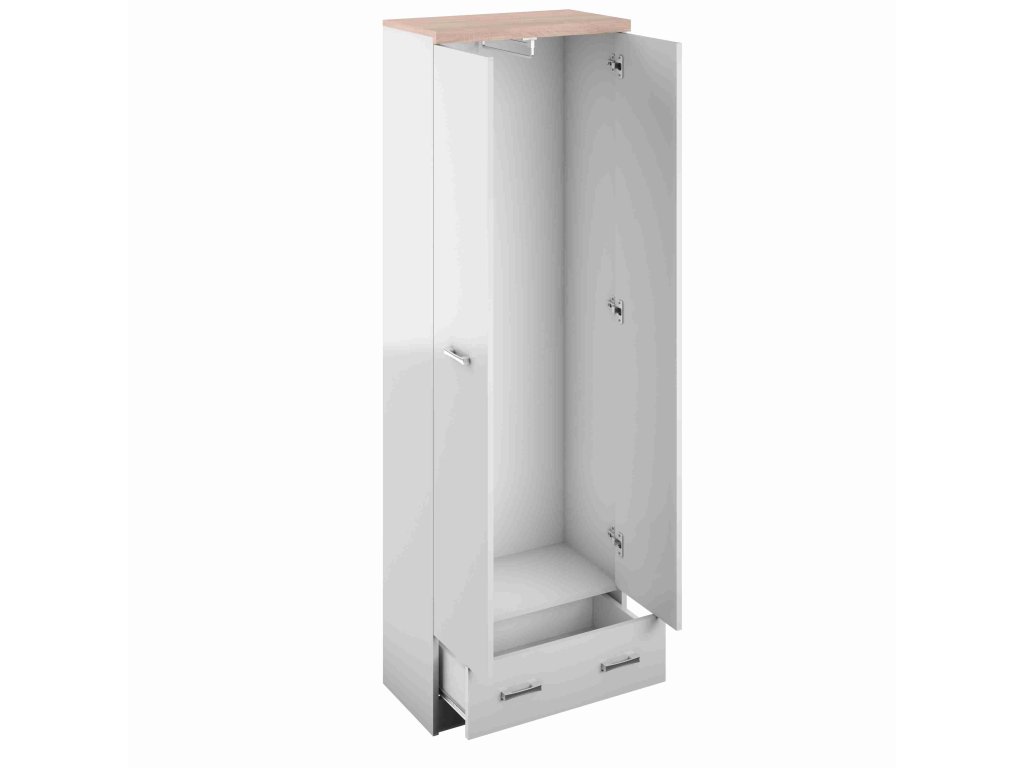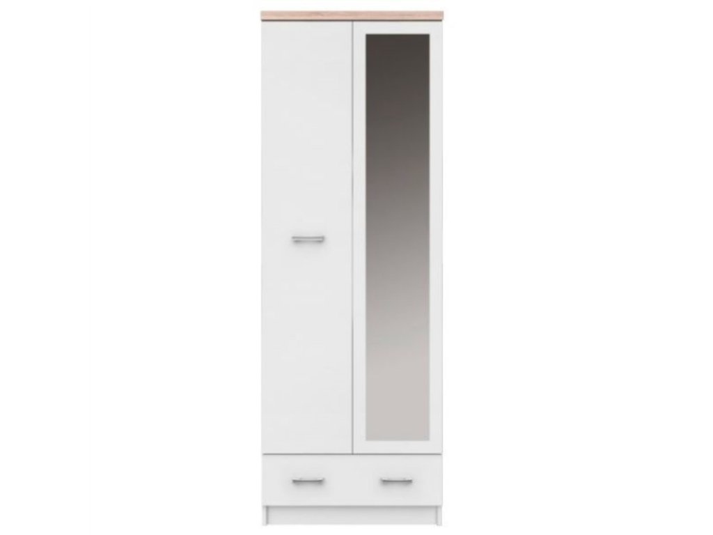Elegantní kombinace čistě bílé barvy a oblíbeného dekoru DUB SONOMA dělá z této skříně ideální doplněk pro vaše předsíně i ložnice. Tato skříň se zrcadlem nejen opticky zvětší a prosvětlí prostor, ale nabízí také praktickou vnitřní polici, výsuvnou šatní tyč a zásuvku pro dokonalý přehled.