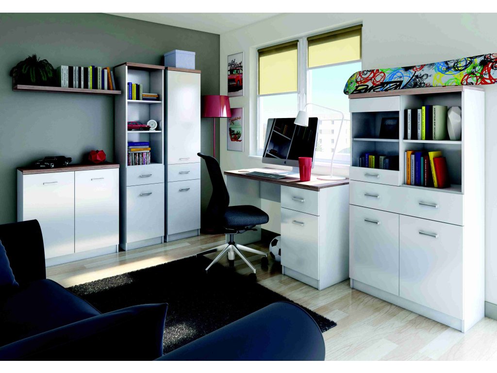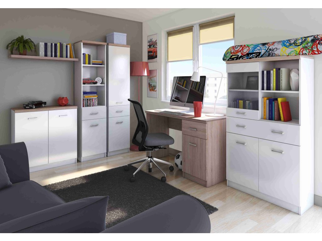 - Studentské pokoje a pracovny: K pracovnímu stolu a regálu se výborně hodí postele v dekoru DUB SONOMA (např. kolekce Netron).