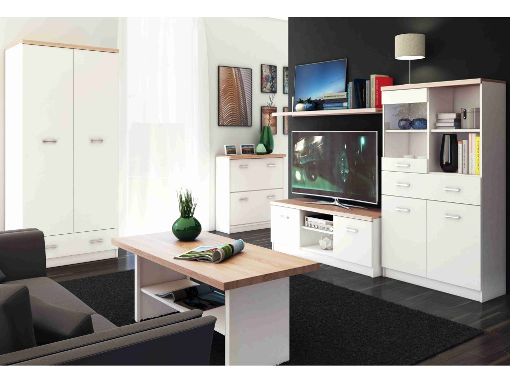 - Obývací pokoje: Vytvořte sestavu s vitrínou, TV stolkem a konferenčním stolkem.