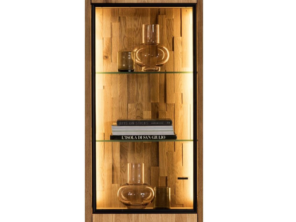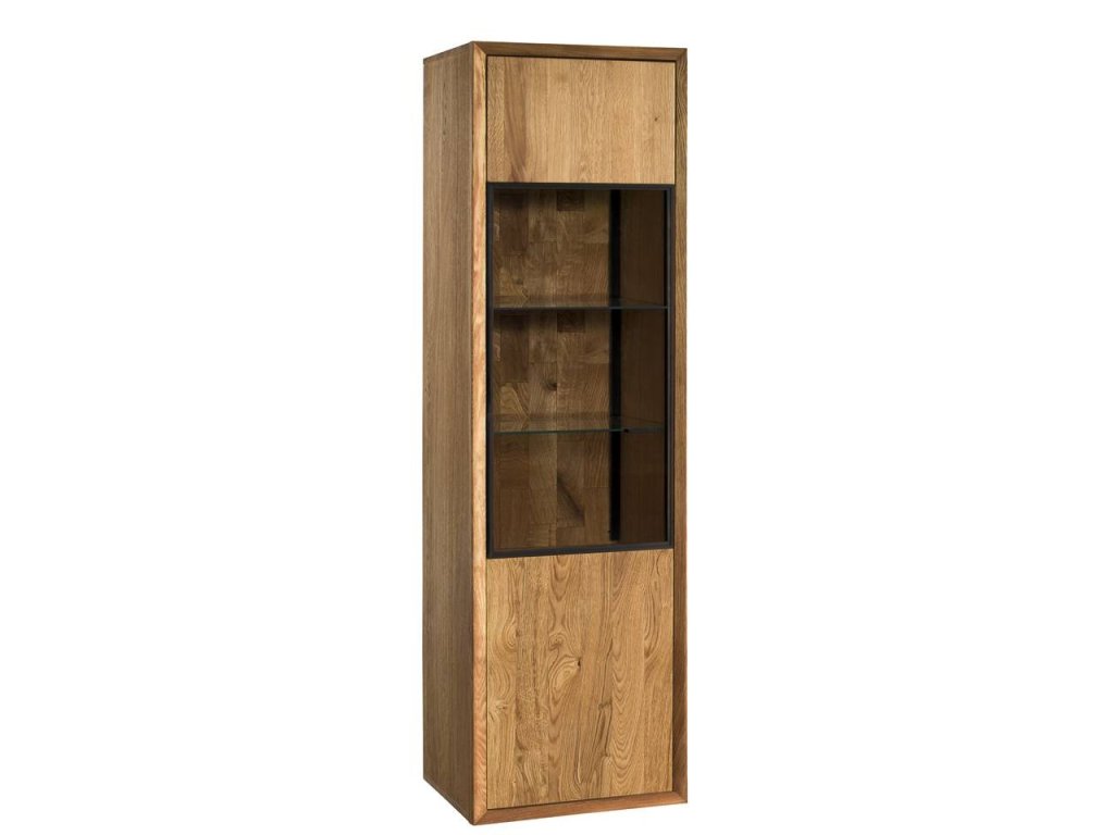 1x Dubová vitrína VIGO 10 (výška 201 cm, šířka 55 cm, hloubka 39 cm).