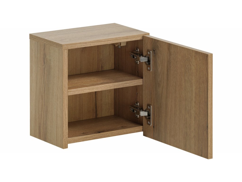 Je elegantní horní závěsná skříňka, která nabízí praktický úložný prostor, ideální pro menší nebo středně velké koupelny. Díky svému minimalistickému designu v přírodním dubovém dekoru skříňka dokonale zapadne do různých stylů interiéru, od moderního po klasický. Je navržena pro efektivní využití vertikálního prostoru, čímž šetří místo na podlaze, což je výhodné i v menších koupelnách.