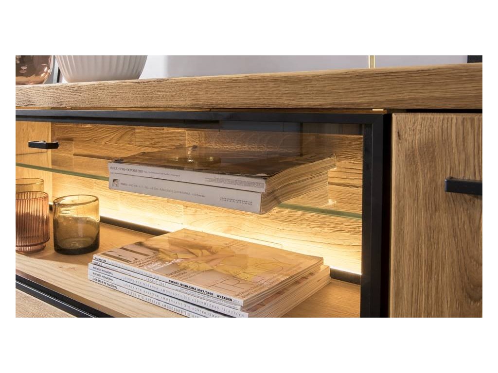Dubový nábytek do obývacího pokoje VIGO 3 je stylový dubový nábytek, který se výborně hodí pro interiéry obývacího pokoje. Prestižní nábytek, který vyzdvihne eleganci a stylový vzhled každé místnosti. Dubový nábytek VIGO se díky svému designu hodí do každé domácnosti. Harmonické sloučení kartáčovaného masivního dubového dřeva, dubové dýhy a kovových prvků působí moderním a jedinečným dojmem.