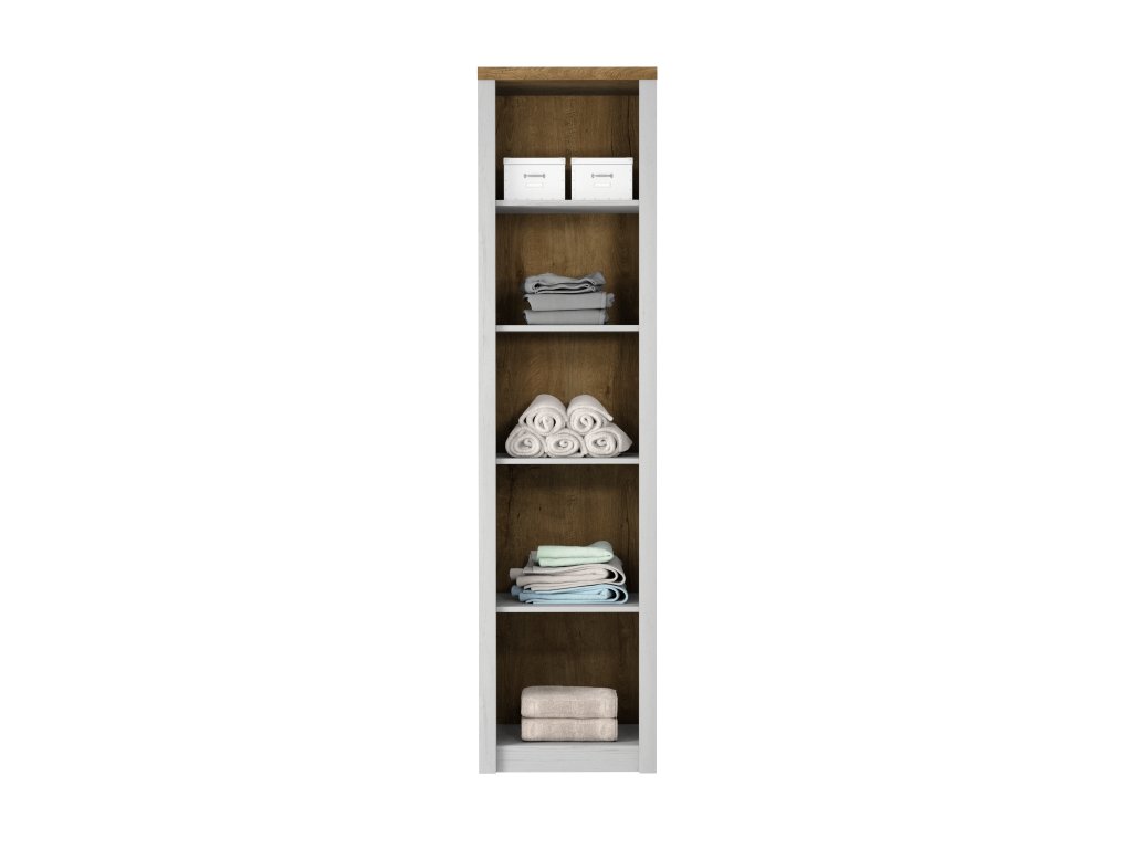 Policová skříň v Provence stylu přináší do vašeho domova lehkost a romantiku francouzského venkova, kombinace bílé barvy s kontrastní deskou v dekoru tmavého dubu působí elegantně a přirozeně. Tato vysoká policová skříň poskytne dostatek úložného prostoru bez toho aby působila těžkopádně, díky svému úzkému provedení je ideální volbou i do menších prostor, jemně frézovaná dvířka a černá kulatá úchytka zvýrazňují venkovský šarm a dodává skříni z lamina osobitý detail.