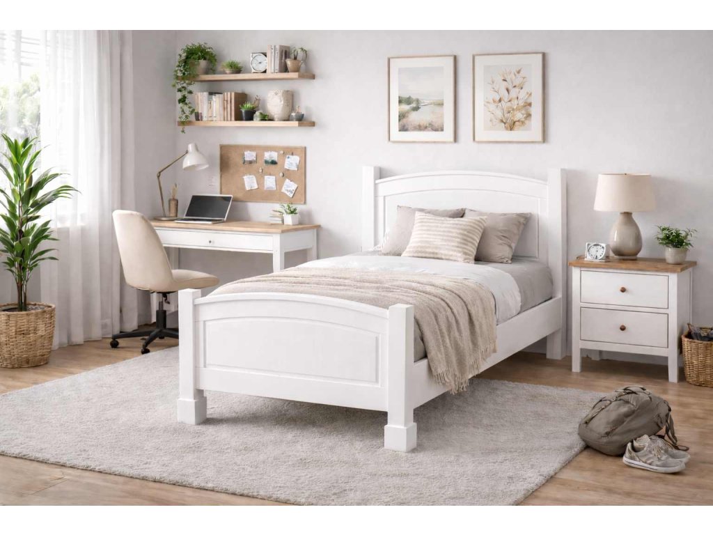 Postel 90x200 cm z masivu z kolekce White Home je skvělá volba pro každého, kdo chce v ložnici poctivý materiál, stabilní konstrukci a nadčasový vzhled. Tato postel z borovice je vyrobena výhradně z masivního dřeva a ošetřena přírodním voskem, který zvýrazní kresbu dřeva a zanechá povrch příjemný na dotek. Výsledkem je pevná postel 90x200 cm, která se hodí do moderních i venkovsky laděných interiérů.