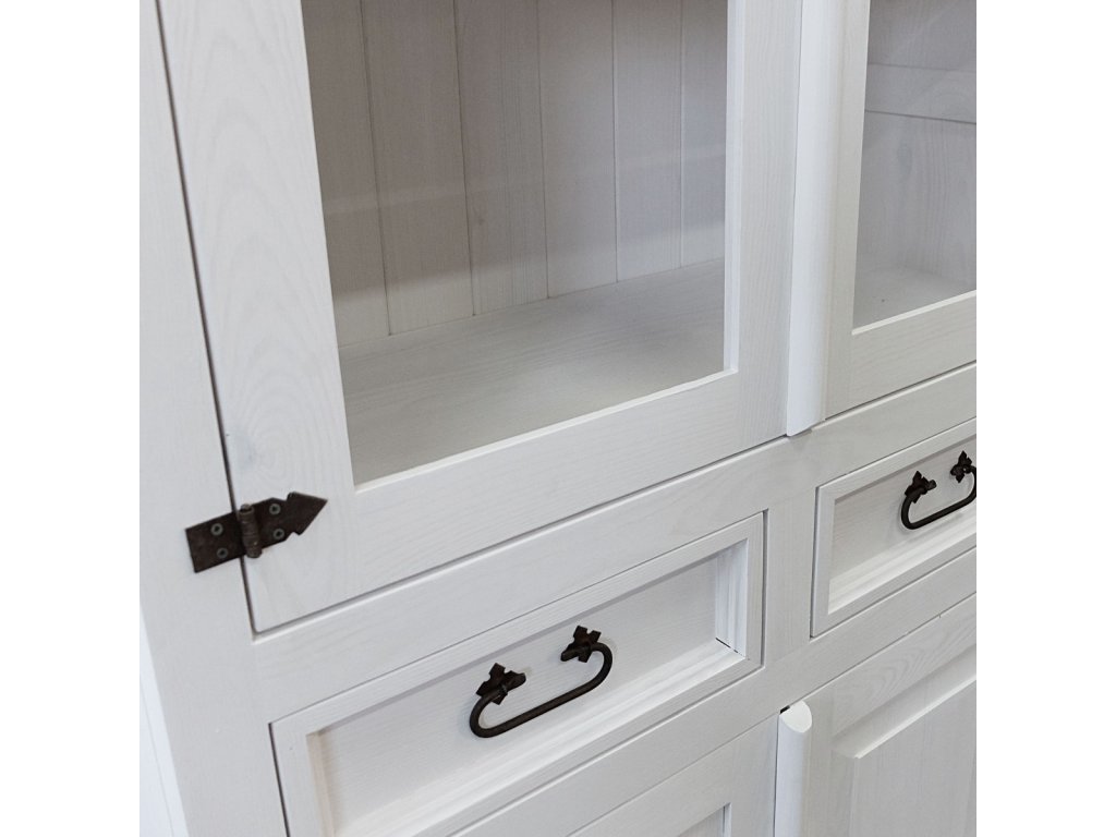 Rustikální vitrína SWEET HOME patří mezi oblíbený produkt našich stálých zákazníku. Vitrína je vyrobená z borovicového masivního dřeva a ošetřena bílou vodou ředitelnou barvou anebo v bílo-hnědé barevné kombinaci. Ze dřeva jsou rovněž vyrobeny i pojezdy na šuplíky a zadní část, díky čemuž působí vitrína opravdu luxusně a stylově.