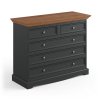 Provensálská komoda BELLUNO 5S je vyrobena z masivní finské borovice a ošetřena vodou ředitelnou barvou v odstínu grafit, která je dokonalým kontrastem ke světlým stěnám a zároveň dodá interiéru eleganci a styl. Horní deska je ošetřena mořidlem v odstínu dub a lakem.