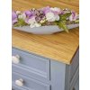 Masivní postel PROVENCE je spojením bukového a dubového dřeva. Dubové dřevo (horní deska) je ošetřeno lakem a bukové dřevo je ošetřeno akrylovou barvou v šedomodré barvě.