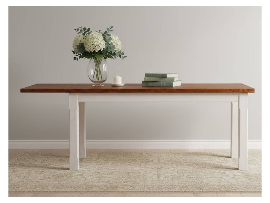 Jídelní rozkládací stůl SWEET HOME je vyroben z borovicového masivního dřeva (tloušťka nohou je 8cm, deska stolu 4cm) a je ošetřen bílou vodou ředitelnou barvou anebo ve dvoubarevné kombinaci (viz. vzorník). Pro snazší údržbu doporučujeme objednat nábytek s vrchní hnědou deskou v lakované verzi. Uvádějte prosím Vámi zvolenou barevnou kombinaci do poznámky při objednávce.