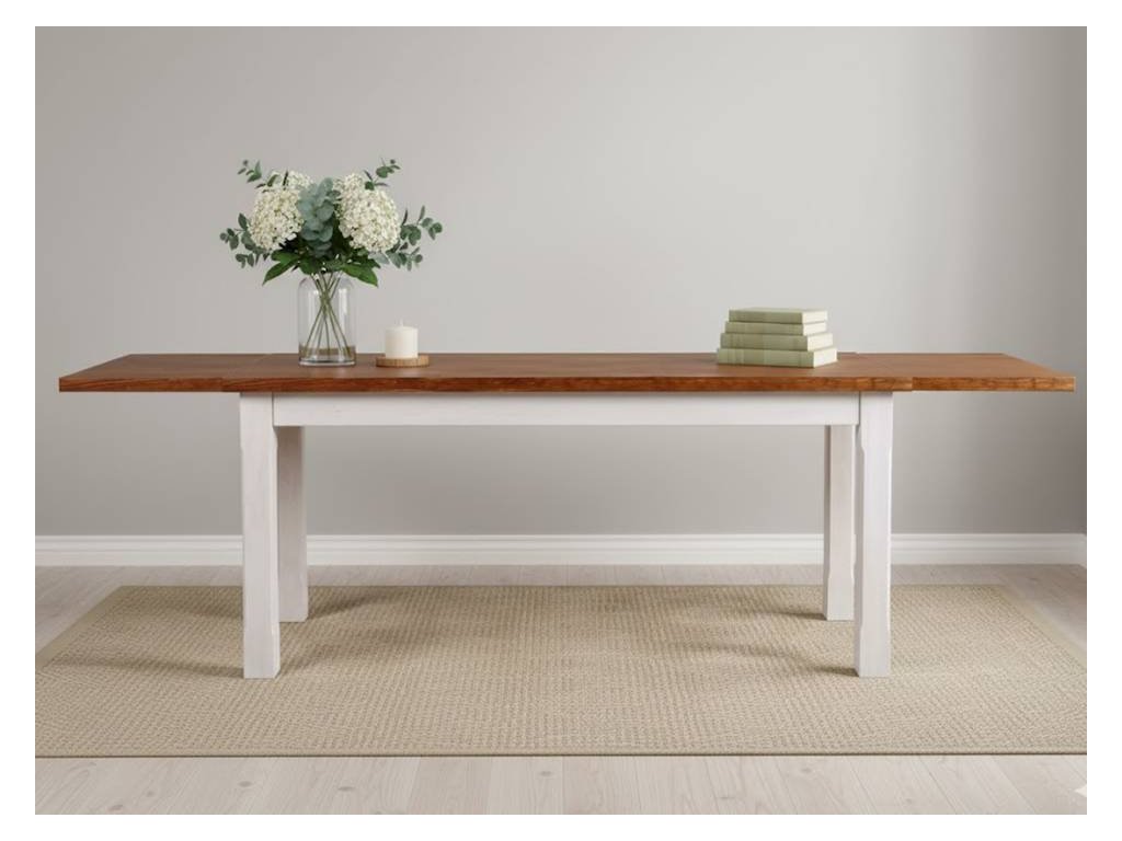 Jídelní rozkládací stůl SWEET HOME stůl SWEET HOME je vyroben z borovicového masivního dřeva (tloušťka nohou je 8cm, deska stolu 4cm) a je ošetřen pouze bílou vodou ředitelnou barvou, anebo ve dvoubarevné kombinaci (viz. vzorník). Pro snazší údržbu doporučujeme objednat nábytek s vrchní hnědou deskou v lakované verzi. Uvádějte prosím Vámi zvolenou barevnou kombinaci do poznámky při objednávce.