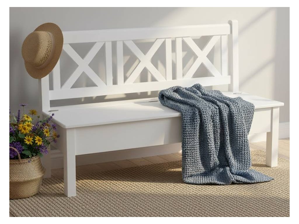 Rustikální bílá lavice SWEET HOME s úložným prostorem je masivní lavice, která nadchne Všechny, kterým je srdci blízky styl Provence, a kteří upřednostňují nábytek s prvky venkovského stylu.