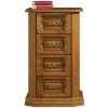 Rustikální komoda KINGA šuplíková úzká je neobyčejně pěkným kusem nábytku z kolekce KINGA. Šuplíková komoda má každý šuplík ozdobně ořezán a navíc jej zdobí stylová úchytka. Rustikální komoda stojí na vyřezávaném soklu, který je stejně jako vrchní deska vyroben z lakované MDF. Boky komody jsou z lamina, přední část tvoří dubový masiv. Šuplíkovou komodu rustikální můžete kombinovat s dalším rustikálním nábytkem z kolekce KINGA.