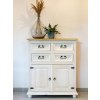 Rustikální komoda WHITE HOME COM 07 je zhotovená z masivní borovice a ošetřena voskem v dvoubarevné či pouze bílé variantě.
