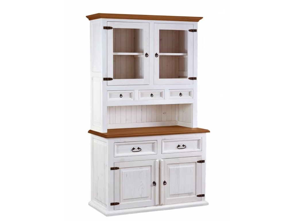 Rustikální kredenc SWEET HOME je masivní příborník či skříň do jídelny i kuchyně, vyrobena z borovicového masivního dřeva a ošetřena bílou vodou ředitelnou barvou. Hnědé části mohou být ošetřeny voskem anebo lakem. Ze dřeva jsou rovněž vyrobeny i pojezdy na šuplíky a zadní část, díky čemuž působí kredenc opravdu luxusně a stylově.