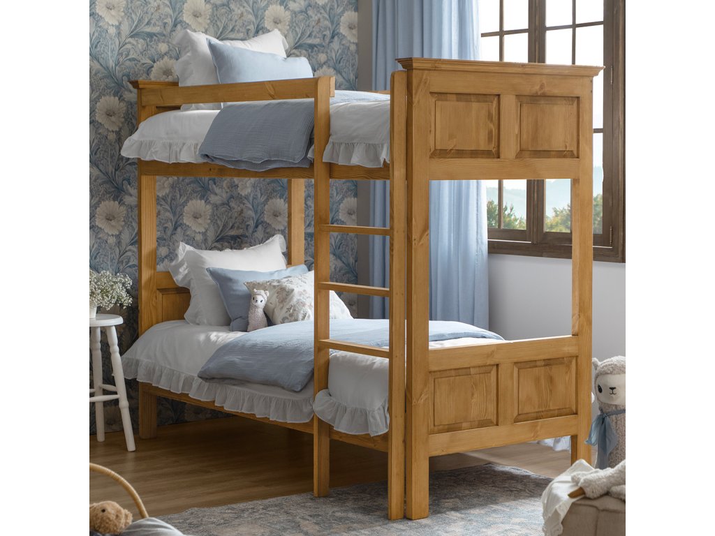 Rustikální patrová postel CORDOBA z masivního borovicového dřeva a ošetřená voskem na přírodní bázi.